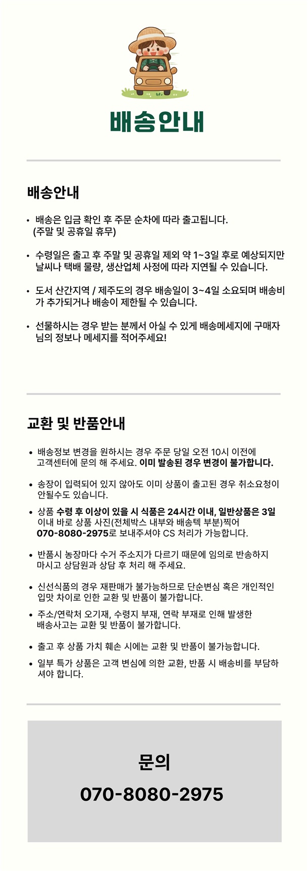 · 배송은 입금확인된 날짜로부터 1~3일 소요되며 최대 7일 이내 출고됩니다. ( 공휴일, 기상악화 등 불가피한 상황에 따라 추가 지연될 수 있습니다.)